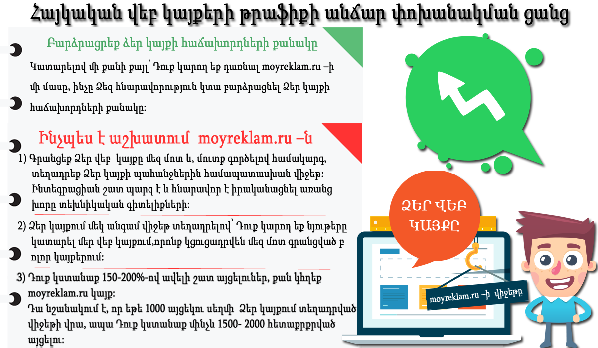 Ցանցից օգտվելու համար կայքերը պետք է համապատասխանեն հետևյալ պայմաններին` - Օրական 100 և ավելի ունիկալ այցելու, - Կայքերը պետք է նախատեսված լինեն հայկական լսարանի համար, MoyReklam.Ru չի համագործակցում այն կայքերի հետ, որոնք` - Չեն բավարարում ցանցի պայմաններին կամ խախտում են ՀՀ օրենսդրությունը, - Խախտում են երրորդ կողմերի հեղինակային իրավունքները, - Պարունակում են անպարկեշտ և անհարգալից արտահայտություններ, - Պարունակում են սեքսուալ բնույթի նյութեր: MoyReklam.Ru ցանցն իրավունք է վերապահում առանց բացատրություն ներկայացնելու հրաժարվել կայքի |